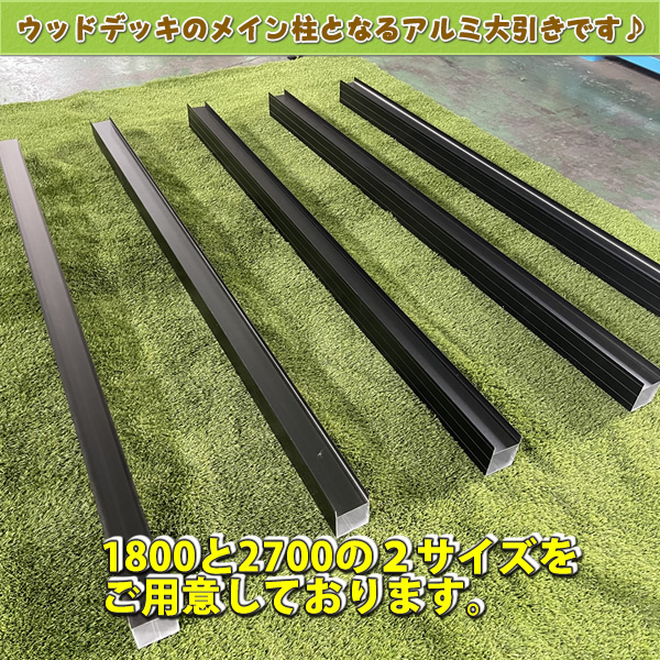 人工木ウッドデッキ設置用の「アルミ大引き材1800」が新登場! 本格的な人工木ウッドデッキ製作に最適♪ 強度も高いアルミ製でデッキメインの下地材としてご使用いただけます♪ ■サイズ:1795mm×68mm×89mm ■素材:アルミ製 ■カラー:マットブラック ※人工木ウッドデッキの部材拾い出しは、下記のデッキ設置マニュアルPDFをご参照ください。→人工木ウッドデッキ組み立て説明書PDF |