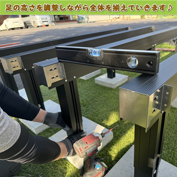 次に調整束柱のボルトネジを仮止めしていきます。 予定の高さに合わせて束柱の長さを調整し、ネジを固定します。』