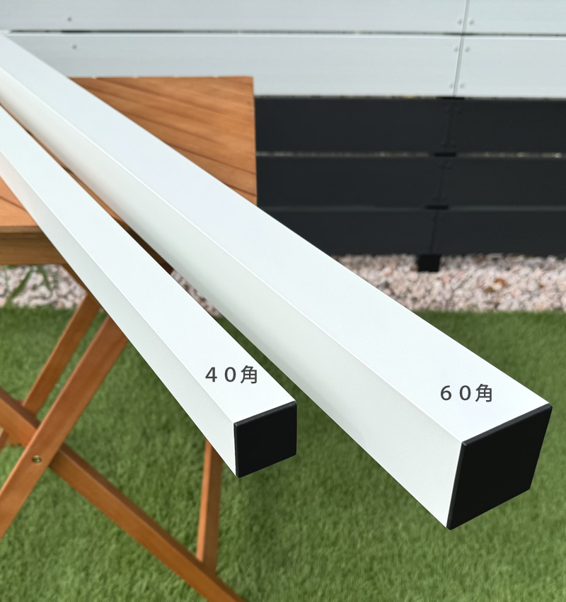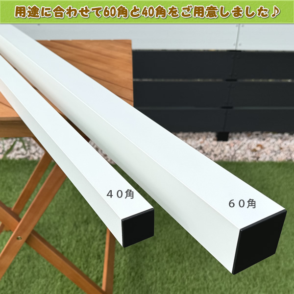 ↓「アルミ支柱のサイズは、用途に合わせて60角、40角の2種類をご用意しています♪」