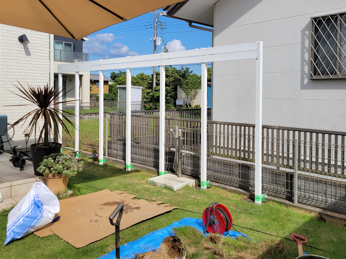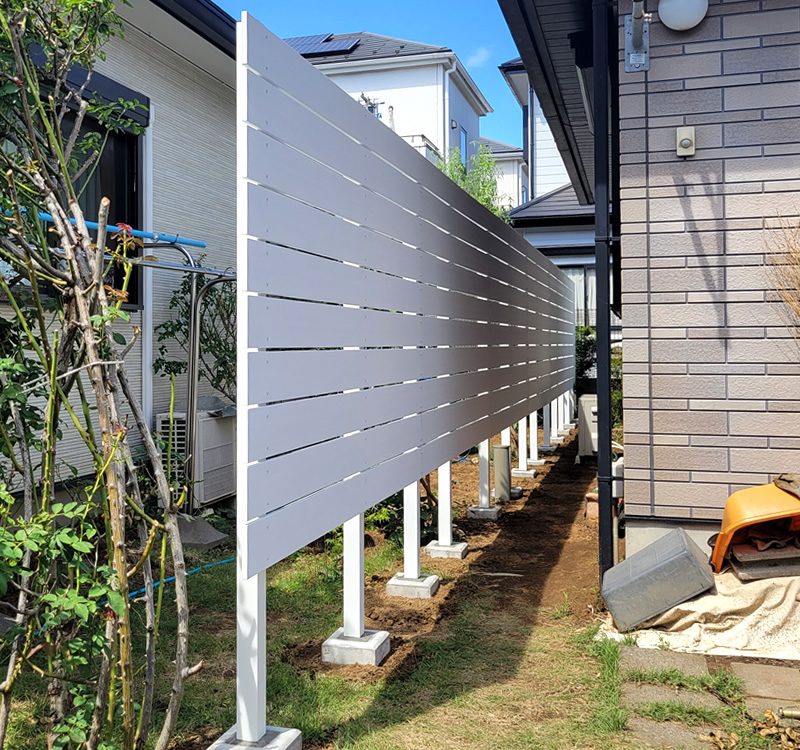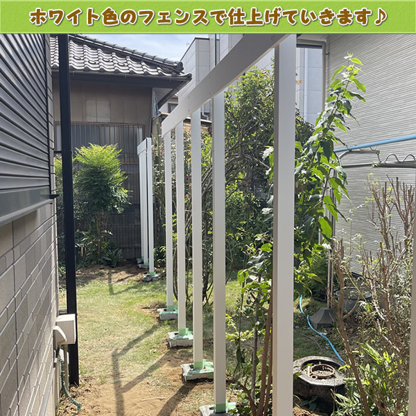 ↓「ホワイト色の人工木フェンス設置風景をご紹介いたします。こちらでは高さ約2m、幅約12mにて一直線に設置されています♪」
