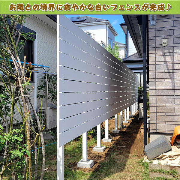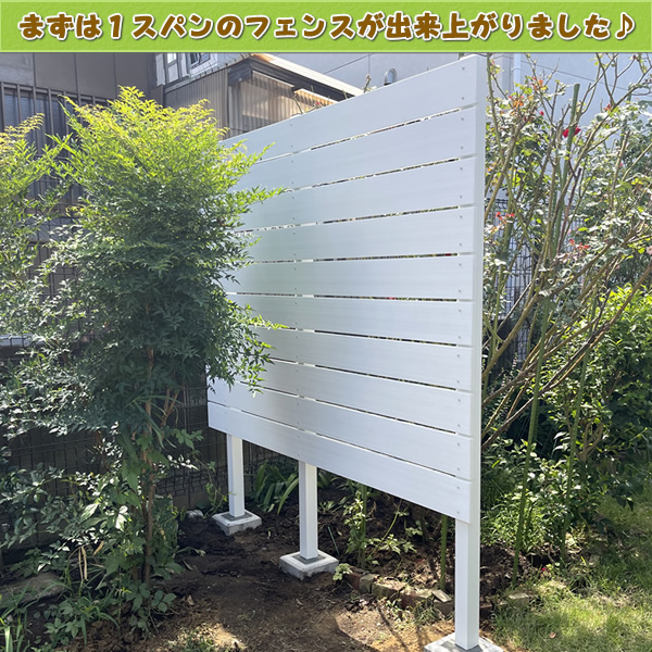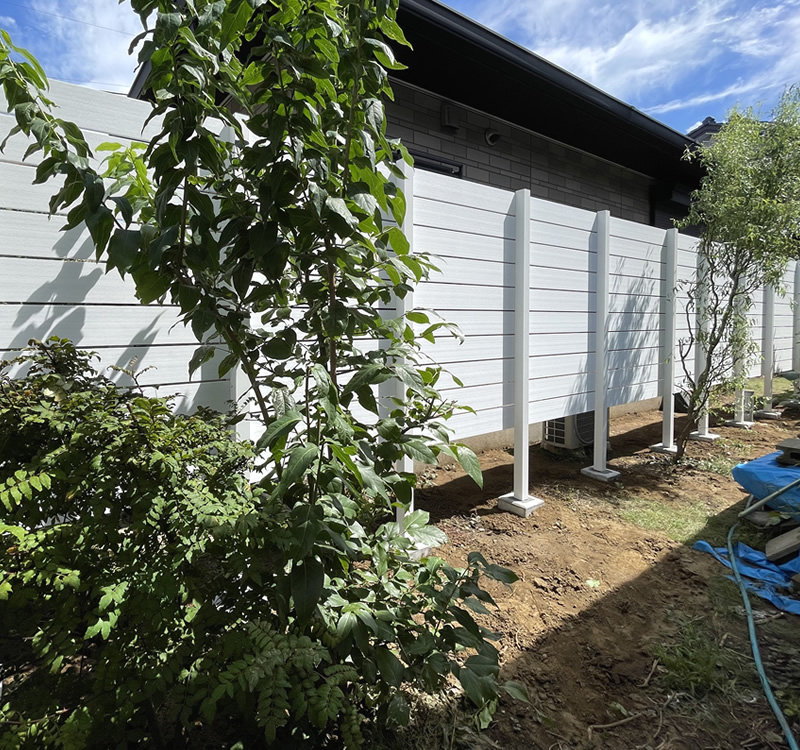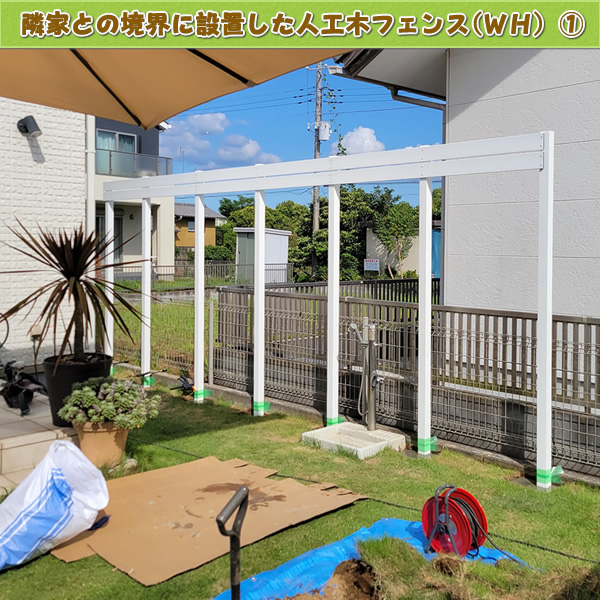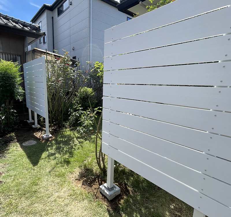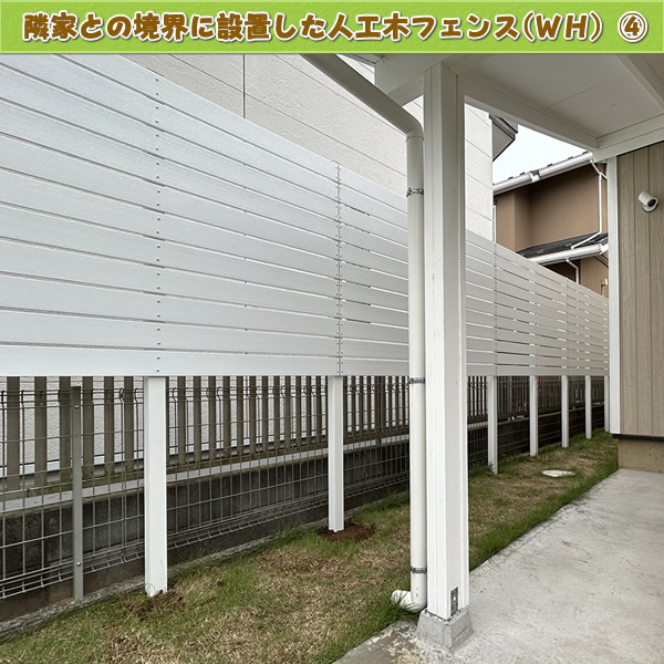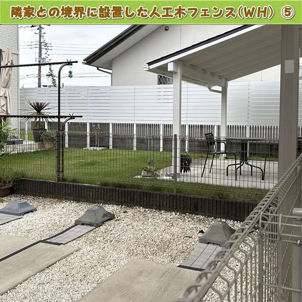 ↓「続いてこちらは隣家との境界沿いに設置した、人工木目隠しフェンス(ホワイト色)です♪」