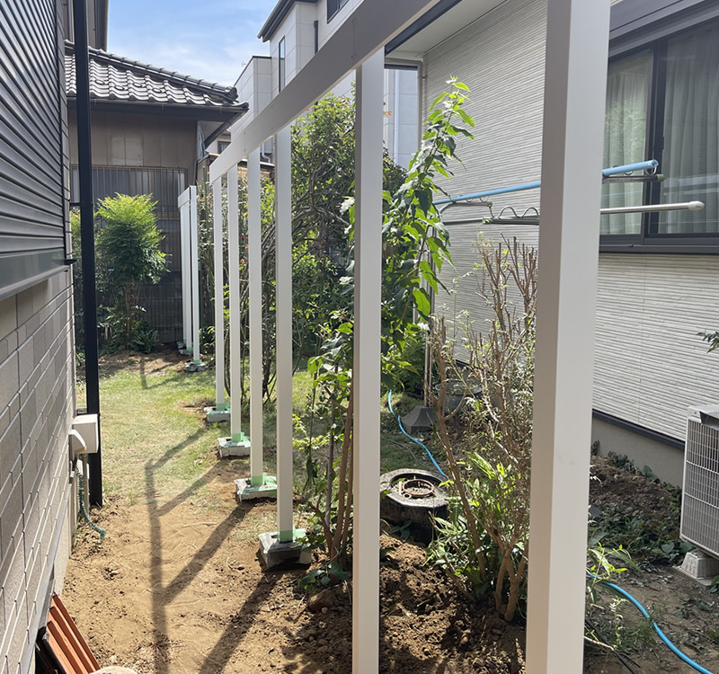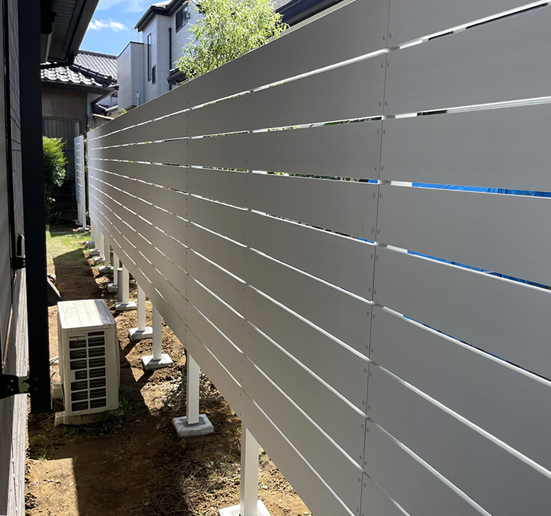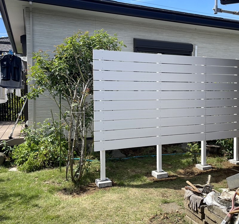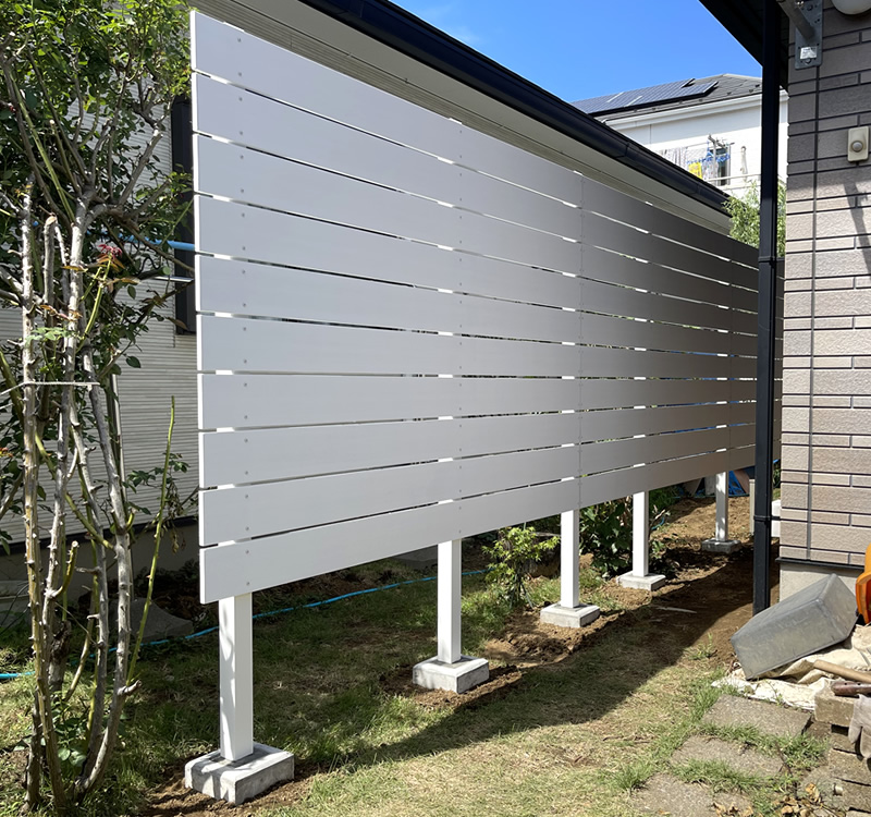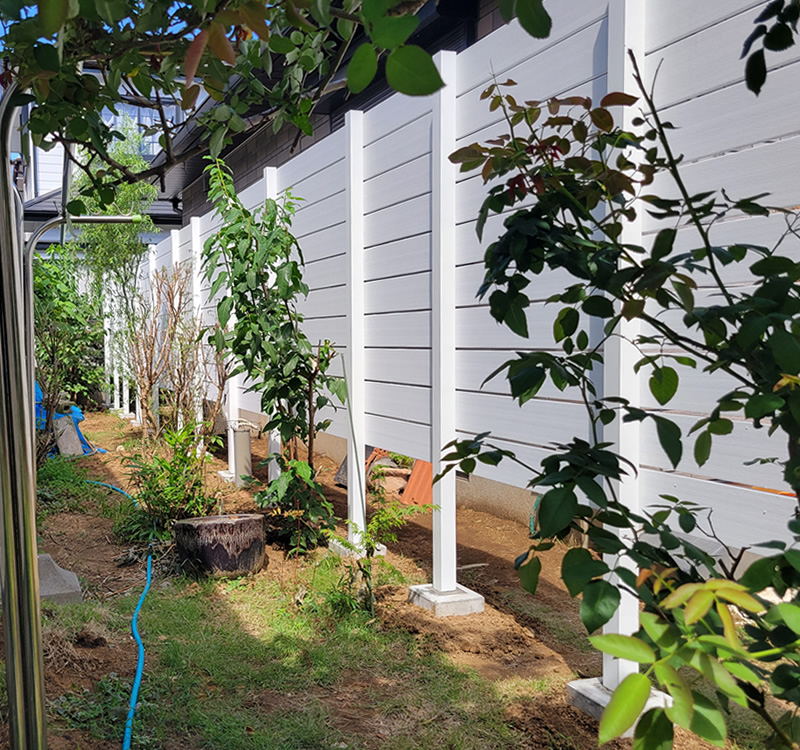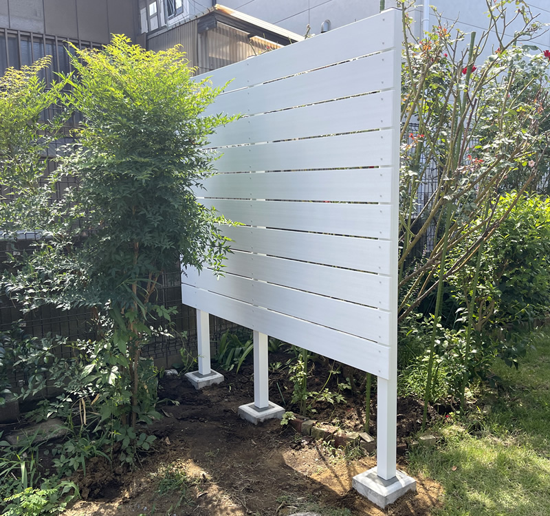 ↓「続いてこちらは隣家との境界沿いに設置した、人工木目隠しフェンス(ホワイト色)です♪」