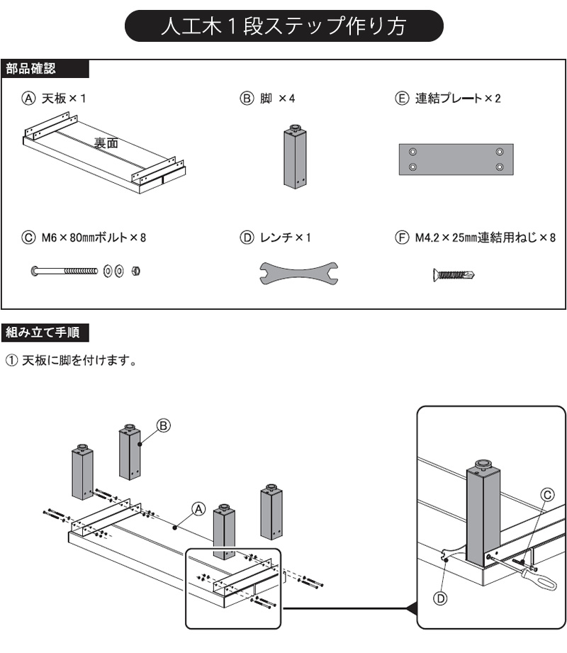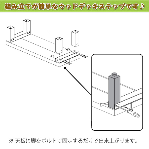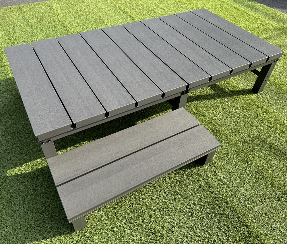 ↓『足場も広くて滑りにくい床板が特徴の人工木1段ステップです。 簡単組立でお庭への動線を快適にします。
