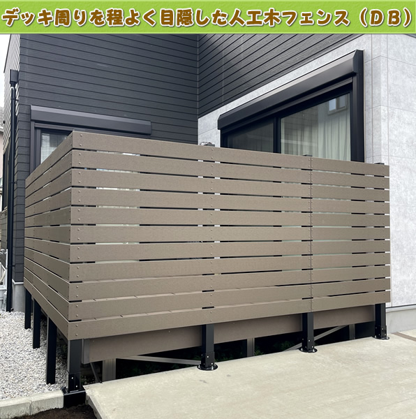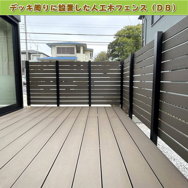 「続いてこちらはウッドデッキを囲うように設置した、ダークブラウン色の人工木フェンスです♪ シックな色合いが外観になじみ、落ち着きのあるくつろぎ空間が完成しました☆」