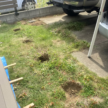 ■ まずは人工木フェンスを立て終えたら、控えを作る予定の場所に基礎を作ります。