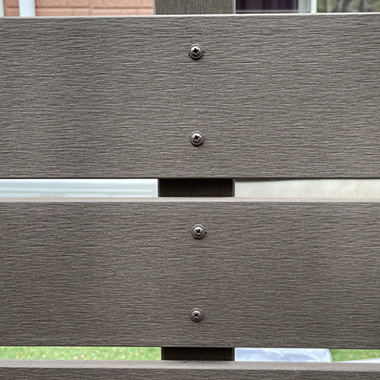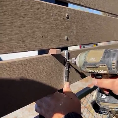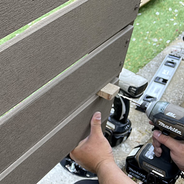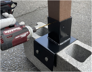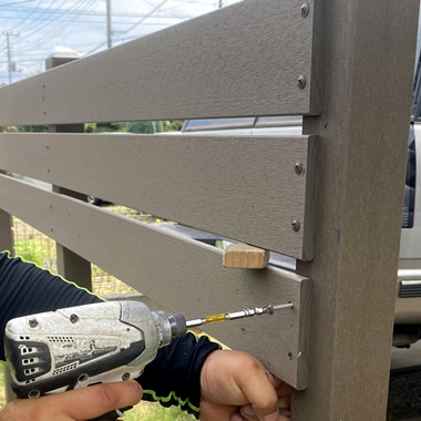 人工木材のビス留め風景です。人工木ポストに対して上下2本ビスで留めることで、がっちりと固定されます♪