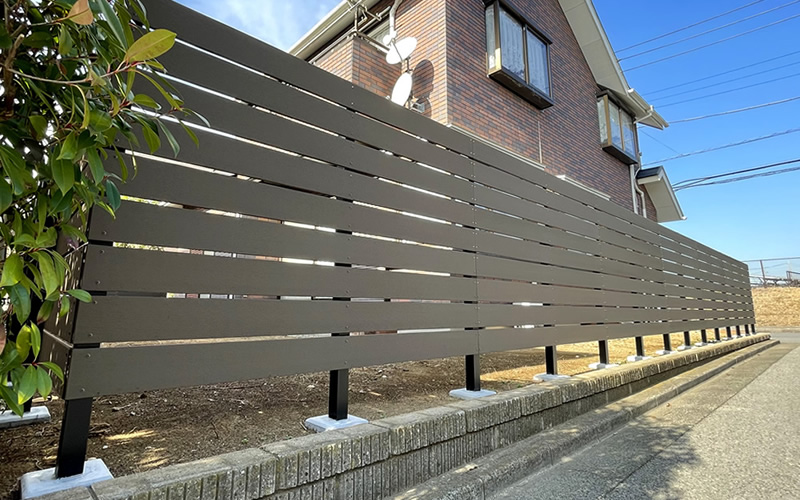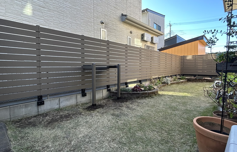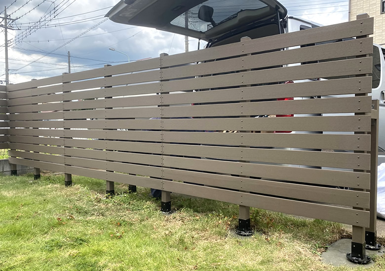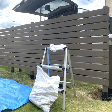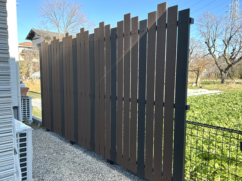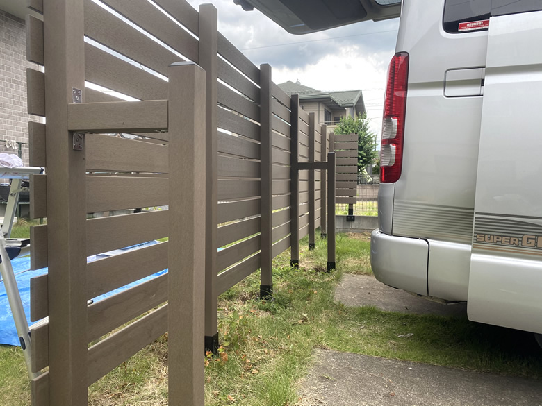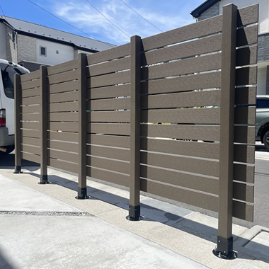 → 駐車場の仕切りとして設置した人工木フェンス(ダークブラウ色)
