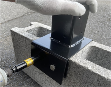 ブロック塀に金具をはめたら、ボルトを交互に少しづつ締め付けていき、しっかりと固定します。