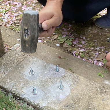 穴を開けた4箇所にアンカーボルトを差し込んで、上からハンマーで叩いていきます。