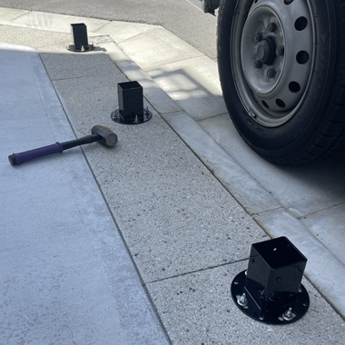 コンクリートの上に設置するパターンとして、平地用金具を使用した設置方法をご紹介いたします。