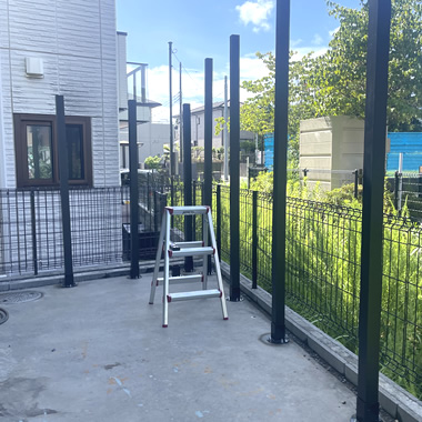 なお、背の高いフェンスを設置する場合は、写真のように風対策の「控え」を設置することで全体の安定性がさらに高まりますので、ご参考にしていただければと思います♪』
