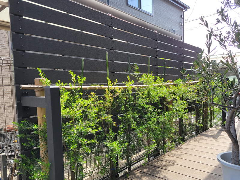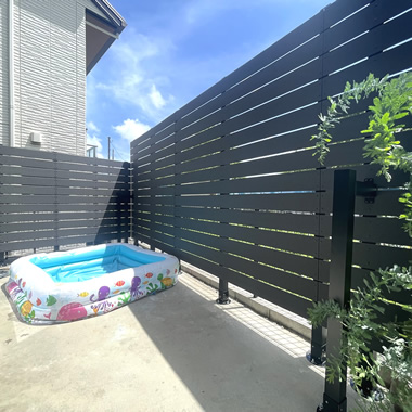 → お庭周囲にL型で設置した人工木目隠しフェンス(ブラック色)設置例