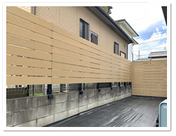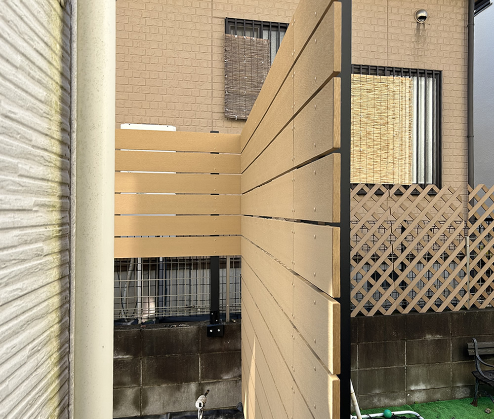 ↓『ベージュ色の人工木フェンスが完成しました! 外からの視線を程よく遮り、明るくやさしい印象のお庭空間が出来上がりました♪』