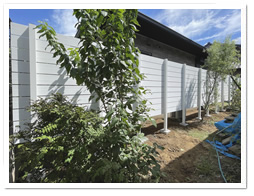 ↓『まずは端部のフェンスが出来上がりました。こちらではホワイト色の人工木フェンスをご採用いただいております♪』