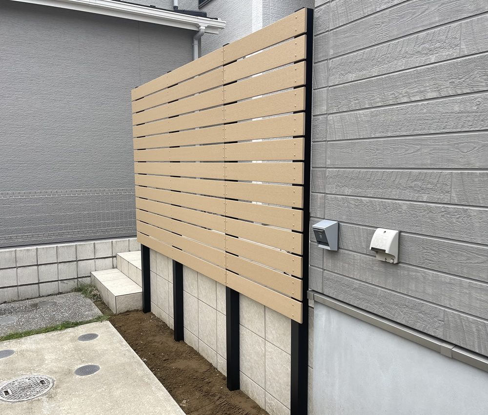 玄関前はタイルデッキとなっておりますが少々高さがあるため、目隠しと安全対策を兼ねた人工木フェンス設置のご相談をいただきました♪』