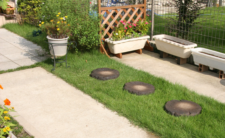 切り株敷石はFRPとはいえ、年輪が刻み込まれている上、形もいびつに作っているので何となく本物感がありますね。